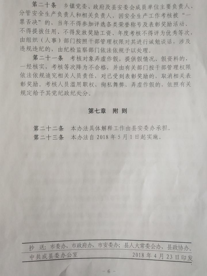 第十八条 乡镇党委、政府及县安委会成员单位考核结果经县委、县政府同意后,由县安委会向社会公布,并抄送纪检监察、组织人事等有关部门,作为领导班子评价、干部使用和县委、县政府表彰奖励重要依据。