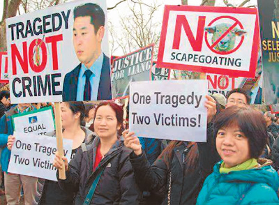 图为2016年2月,美国多个城市的华侨华人社团组织声援华裔警官梁彼得大游行。资料图片