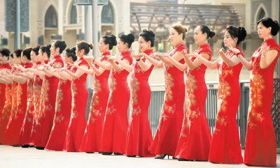 图为2017年春节期间,阿联酋旗袍协会发起的中华文化快闪活动在迪拜举行,来自阿联酋、日本、美国、法国等十多个国家的近500名华侨华人齐聚现场进行了旗袍走秀、书法、武术等表演。张澍民摄(新华社发)