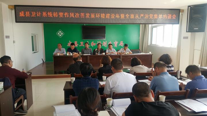 2018年5月19日,在成县卫计局六楼会议室召开了转变作风改善发展环境建设年工作推进会暨全面从严治党集体约谈会。会议由卫计局副局长张志诚同志和石贵平同志主持,县纪委第七派驻组一行三人出席了会议,参会的还有县直医疗卫生机构负责人和党支部书记、各乡镇卫计办主任、卫生院(分院)院长、卫计局领导班子成员及副科级以上领导干部、相关股室负责人共计80余人参加了会议。