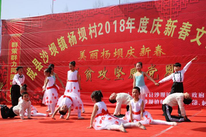舞蹈《喜庆临门》《公主的梦想》《中国吉祥年》《三字经》《快乐宝贝》《草原情缘》《健康动起来》,独唱《花桥流水》《一壶老酒》《红星照我去战斗》《夜空中最亮的星》,合唱《拉住妈妈的手》,自编自演的歌曲《美丽杨坝》《颂杨坝》……28个精彩的节目一个连着一个,将这个昔日在贫困线上挣扎的小山村“闹”了个热火朝天。在一片欢声笑语中,大家以不同方式尽情宣泄着内心的愉悦,表达着对党的脱贫攻坚政策的感激之情和对新的一年美好祝福,整个乡村无不沉浸在过年的喜庆氛围之中。